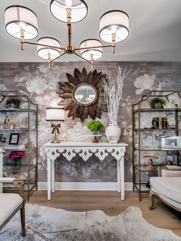 This “YIKES” dining before got a major upgrade by adding neutral floral wallpaper, new flooring and lighting, and updated decor to completely change this formal dining room. A sunbeam mirror made of rustic reclaimed wood justapoxes the detail on the architectural table and feminine lighting.