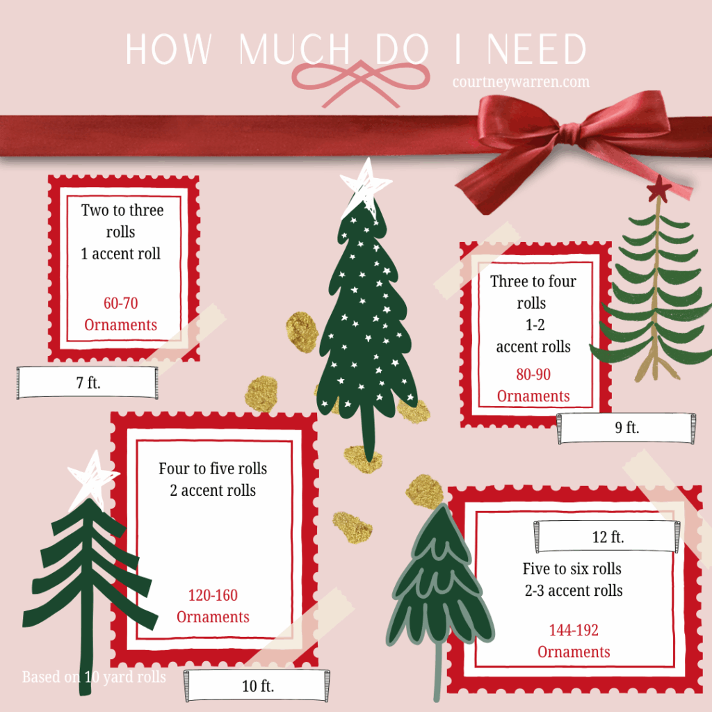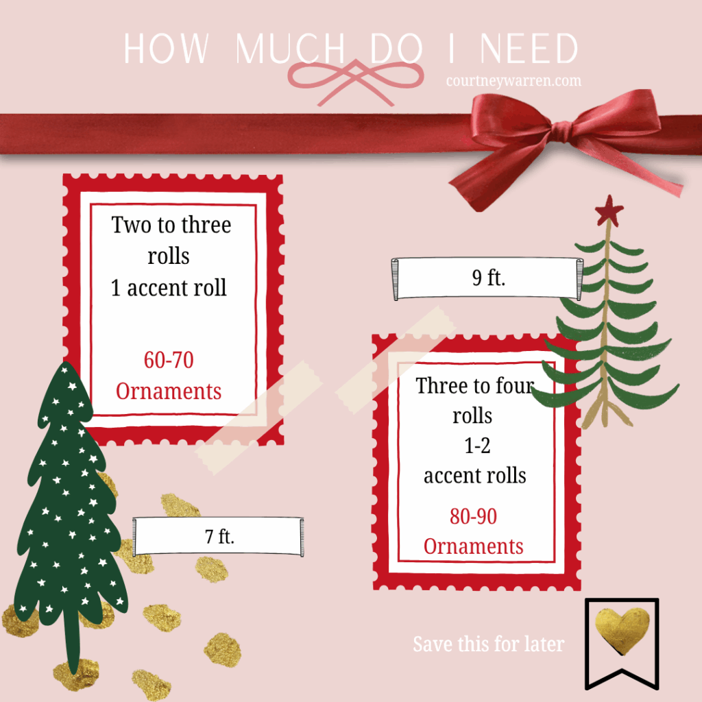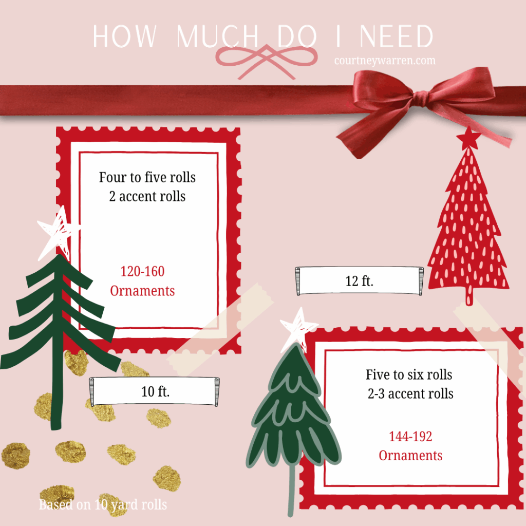 The quantity of ornaments and ribbon based on tree size largely comes down to personal preference, but when in doubt, GET MORE.
